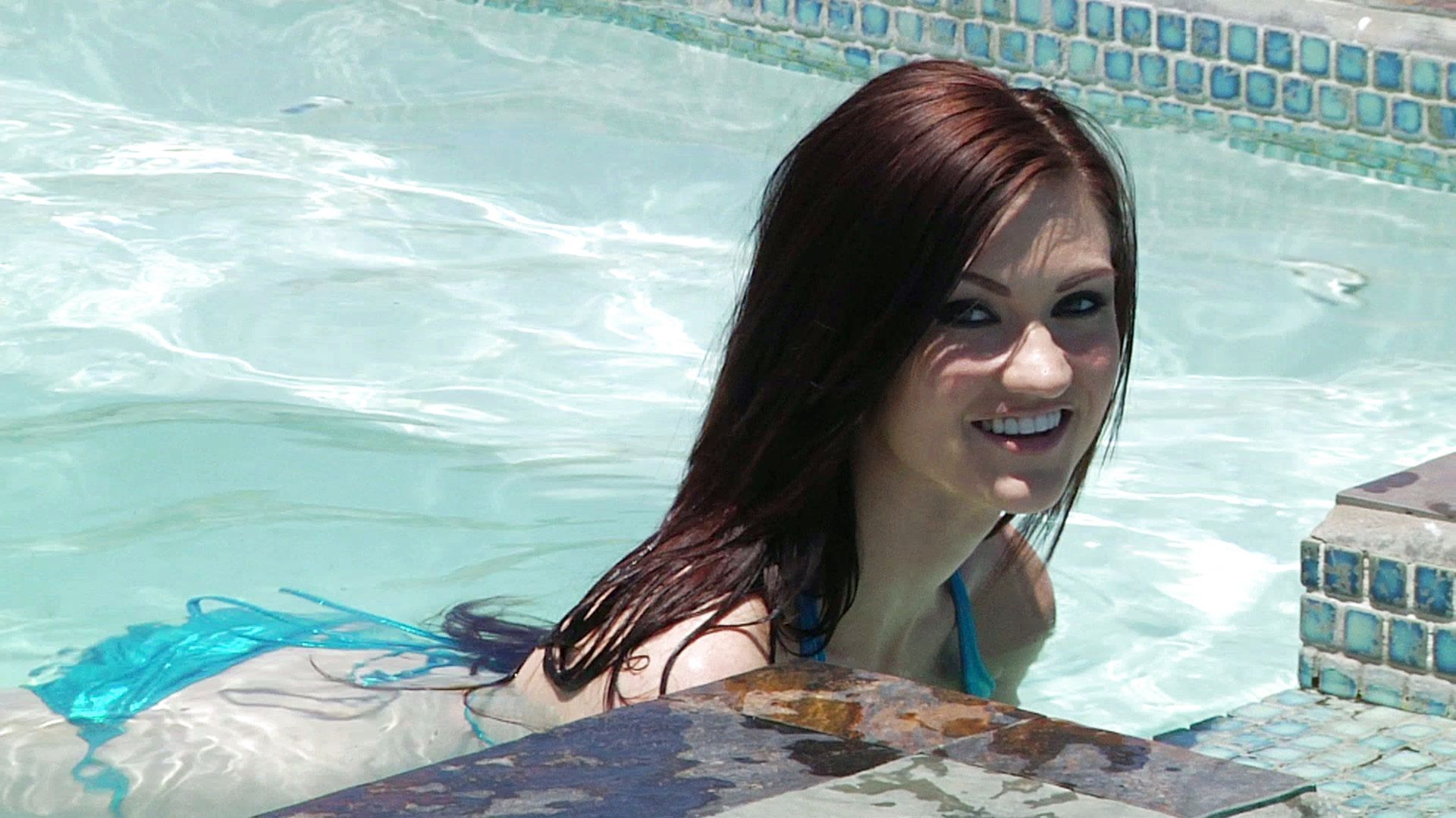 Kendall Karson has big natural tits and a slim body. Her fair skin needs a lot of lotion in the Sun because of her Irish heritage, but her emerald eyes look fantastic with the swimming pool glimmering behind her. A big cock and a cum lunch is all she could ask for to complete this awesome day in Arizona.